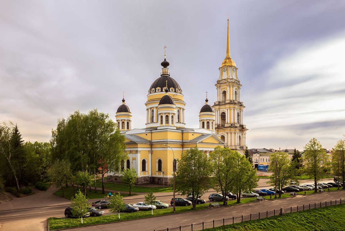 Пройдём мимо бесчисленных храмов, которые были возведены на средства рыбинских купцов. Самый яркий из них — Спасо-Преоображенский собор