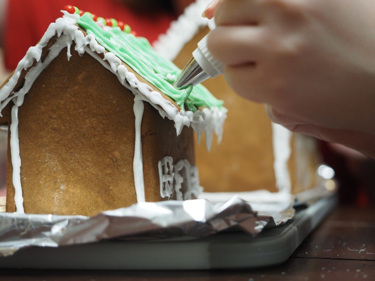 - Вы украсите домик глазурью, посыпками и «снегом» из пищевых ингредиентов — безопасно, вкусно и очень красиво