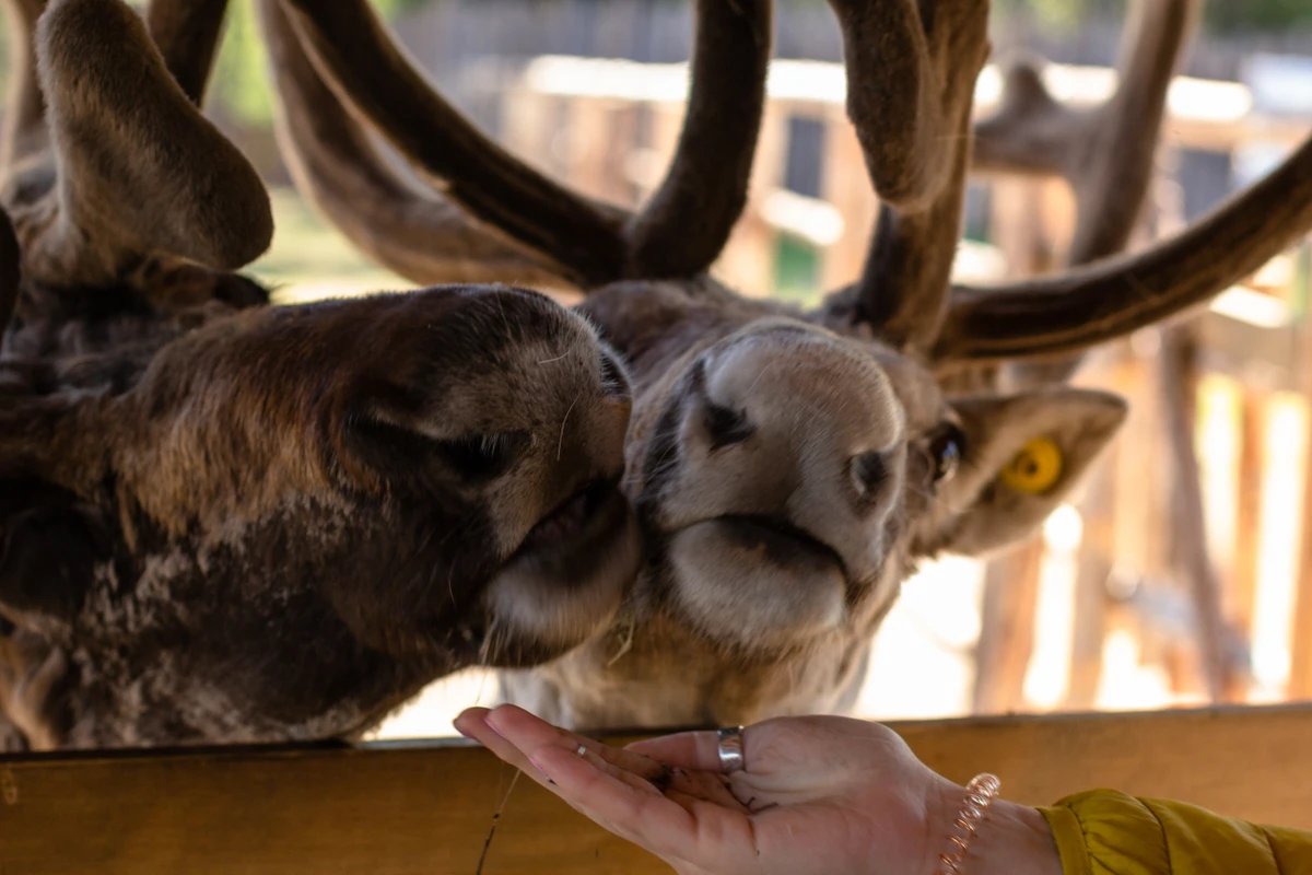 - На территории парка живут северные олени и хаски — можно покормить животных, пообщаться с ними и сделать фото