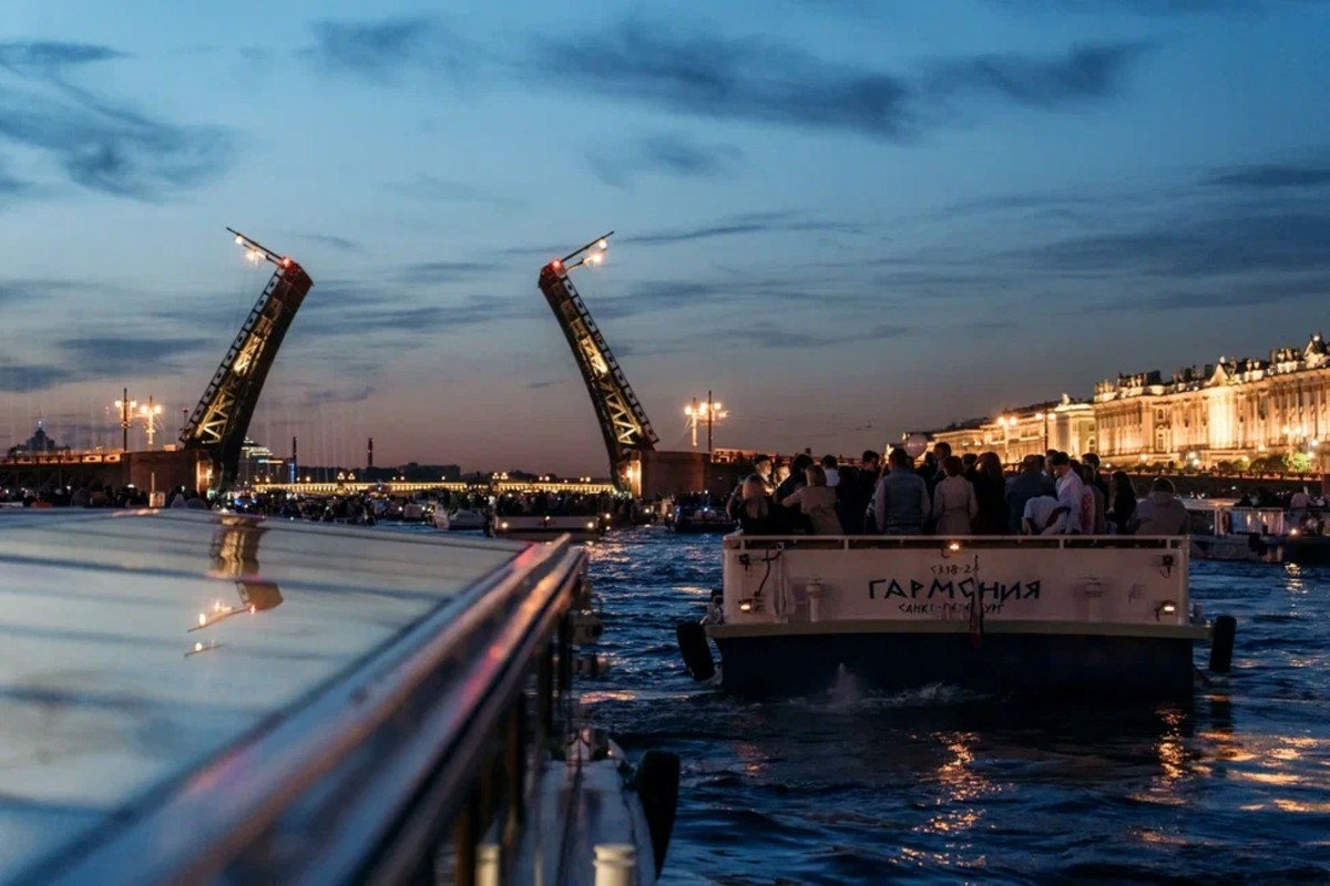 • Кульминацией прогулки станет акватория Невы — вы увидите разведение Дворцового и Троицкого мостов под фоновую музыку, а затем вернётесь в точку отправления