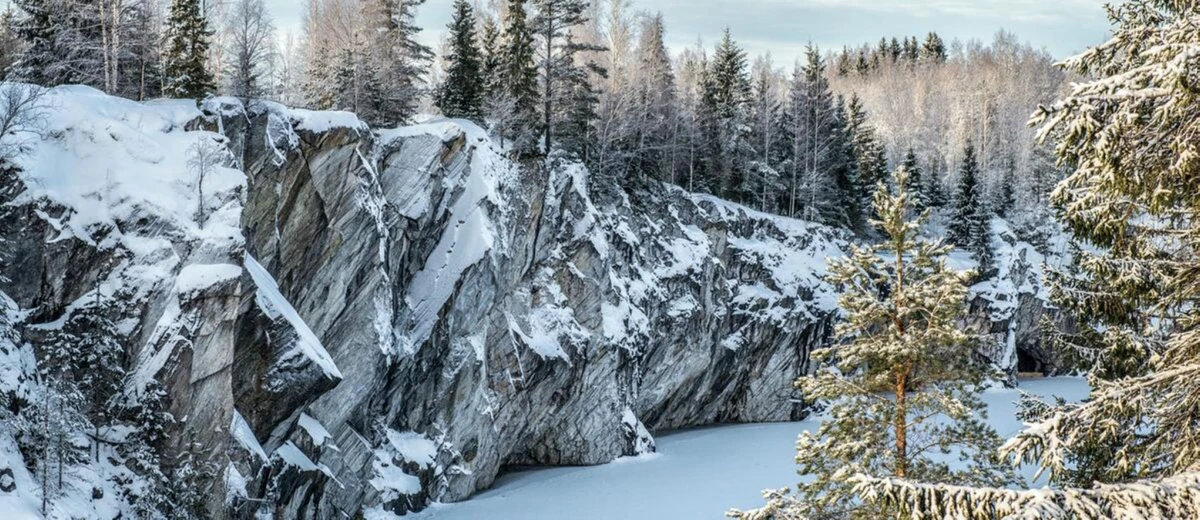 - Горный парк «Рускеала». Наконец-то доберётесь до главной цели путешествия. Прогуляетесь к Мраморному каньону с отвесными скалами, которые обрываются в изумрудную воду. А если захотите, исследуете гроты и штольни, полюбуетесь озёрами и посетите Итальянский карьер