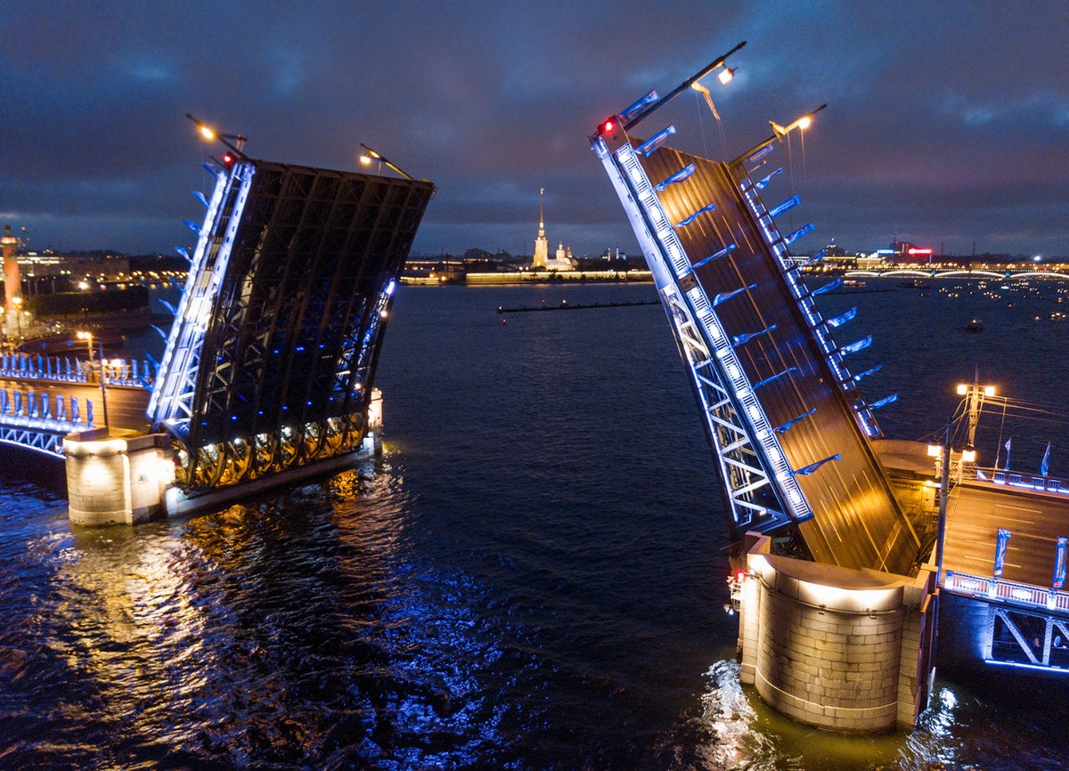 Пятый мост — самый длинный (около километра) и интересно подсвеченный. Увидим его разводку из точки, где безлюдно даже в разгар летнего сезона.