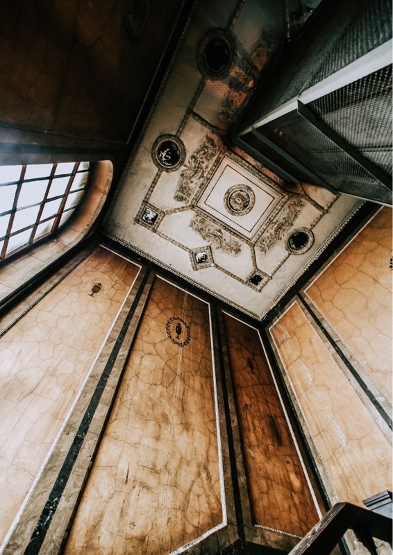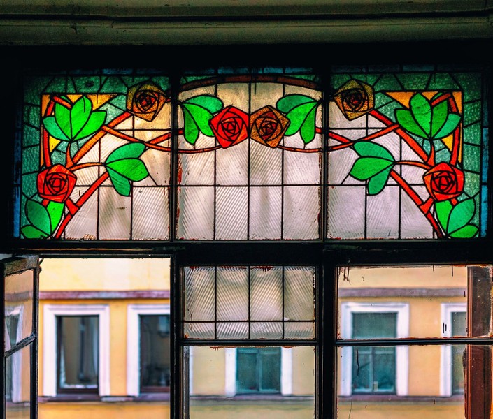 Мы войдём в парадные с витражами, изразцовыми каминами и антикварной плиткой.