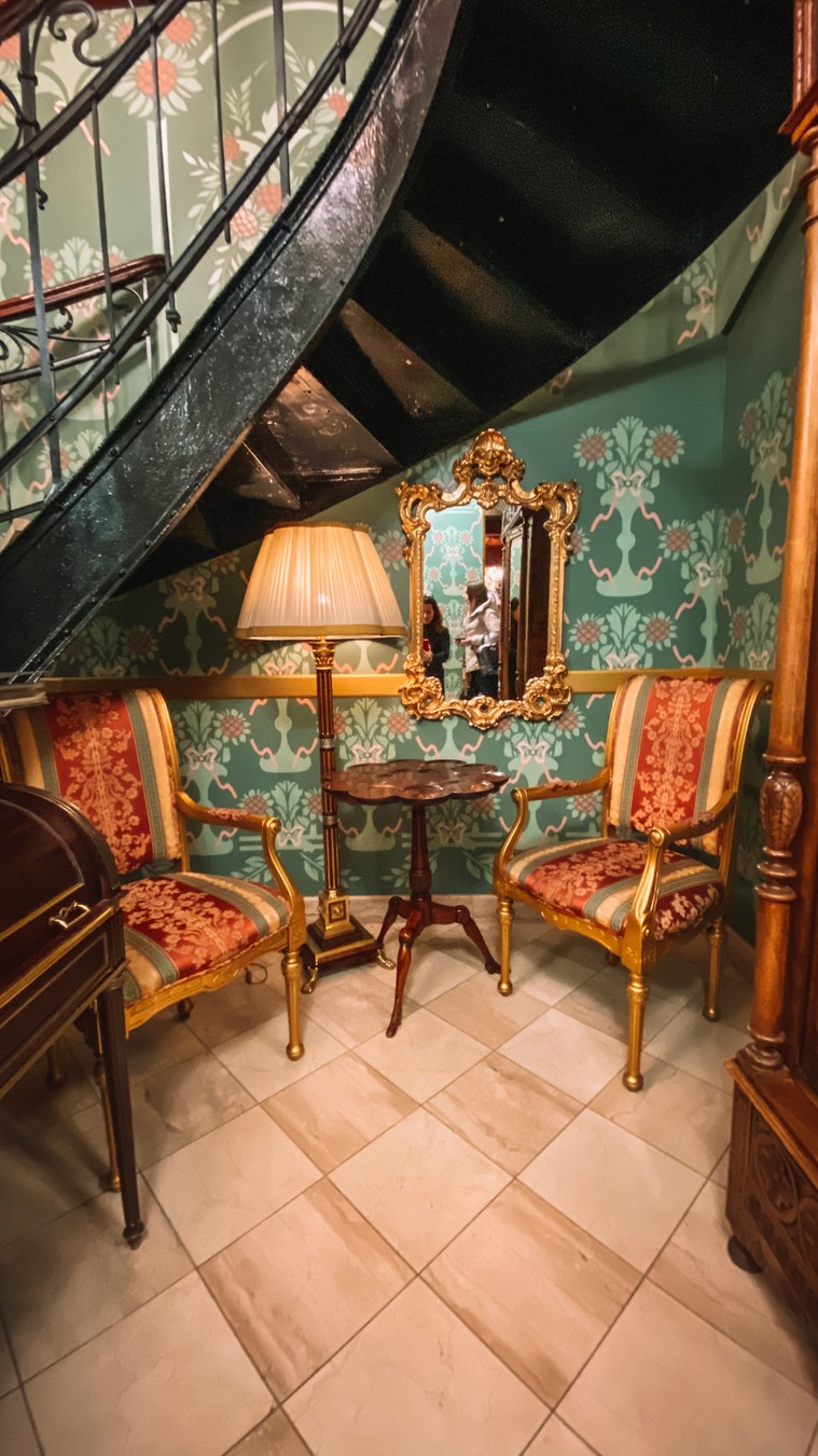 Наша авторская экскурсия проходит в локациях, которые недоступны обычным посетителям магазина купцов Елисеевых, — в историческом кабинете директора, интерьерном балконе, винном погребе и не только. Она построена в формате увлекательного рассказа, проиллюстрированного архивными материалами, фотографиями, данными исследований и показом антикварных предметов из музея. "