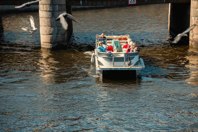 Катер вместимостью от 6 до 11 человек отправится от причала на реке Фонтанке, пройдёт через старинный район Коломна — который почти не показывают на других экскурсиях, далее вдоль закрытых территорий Адмиралтейских верфей выйдет к Финскому заливу вблизи Севкабель порта, где сделает остановку, чтобы вы успели насладиться видом уходящего солнца и сделать памятные фото.