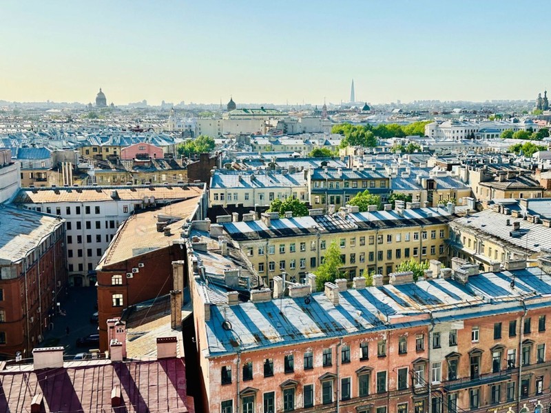 Одна из самых высоких смотровых площадок Петербурга — лишь на 2 метра ниже, чем колоннада Исаакия. Всё, с чем ассоциируется город на Неве, отсюда видно: и Петропавловская крепость с золотым ангелом на шпиле, и Михайловский замок, и «Лахта-центр» — наша «кукурузина» и «башня Саурона».