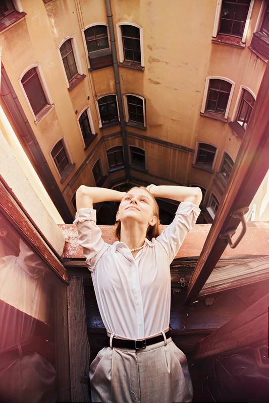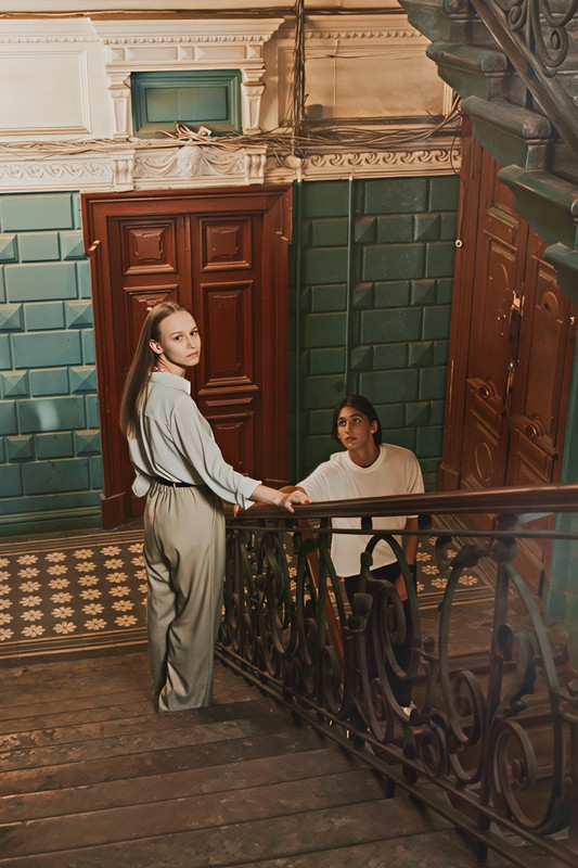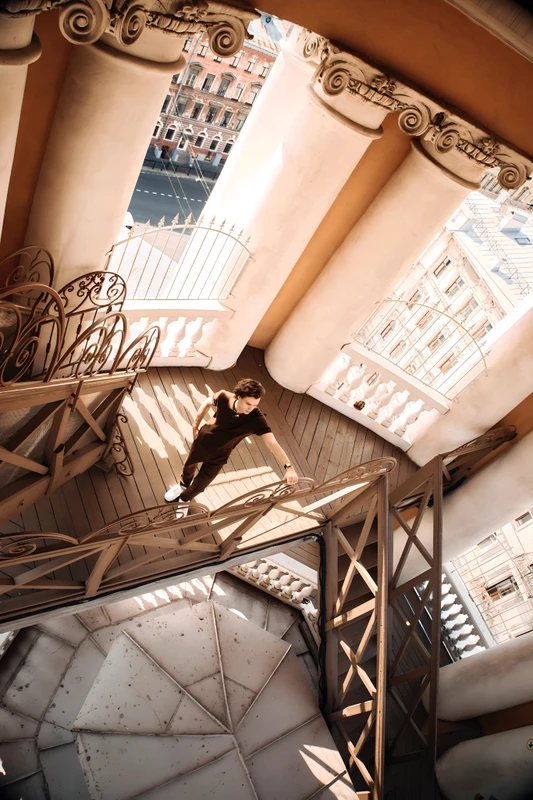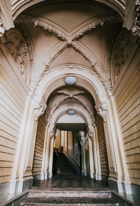 Входим в парадную — сначала тень и скрип тяжёлых дверей на входе, а потом яркий свет через витражные стекла. По пути — таблички с дореволюционными надписями, звонки «прошу повернуть» и другие архитектурные мелочи, о которых не догадываются даже местные. На каждом шагу — кадры, будто из фильма: витражи, лепнина, лучи света в старом окне.