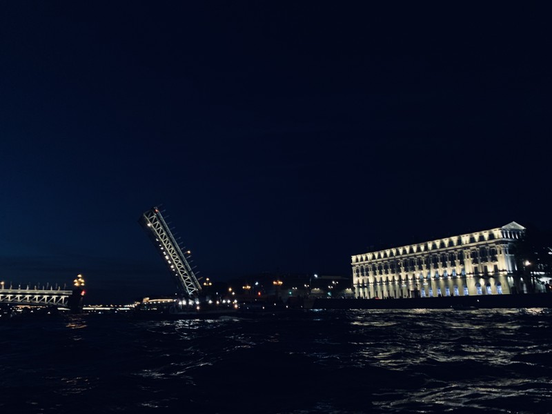 - Осталось дождаться заветного зрелища: в 01:15 будет поднят Дворцовый мост — мост с «тем самым» видом, когда в разведённых пролётах сияет шпиль Петропавловки. За ним поднимутся Благовещенский и Троицкий мосты (капитан примет решение, какой из мостов показать вам, по обстановке)