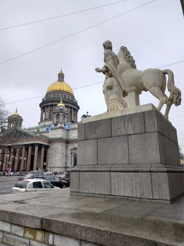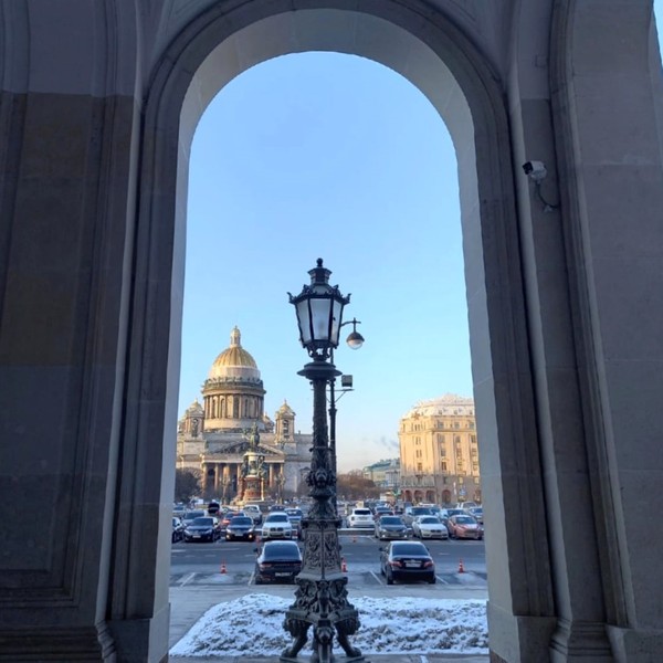 - Исаакиевским собором и архитектурой вокруг него: гостиницами «Астория» и «Англетер», Мариинским дворцом, Синим мостом с водомерным столбом, показывающим уровень наводнения