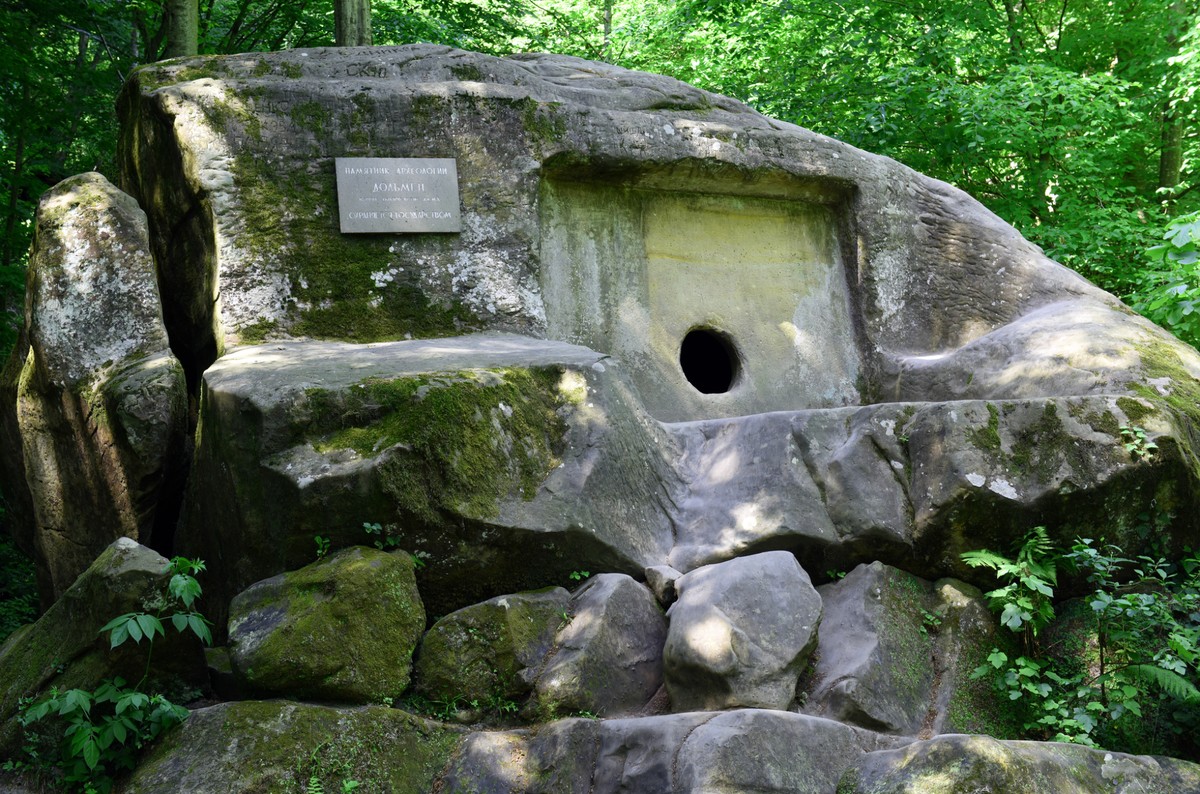 Главная точка нашего путешествия — гигантский Волконский дольмен. Это уникальный памятник, внутри которого могут поместиться несколько человек. Это единственный в мире полностью монолитный дольмен. Всё его внутреннее помещение, камера, было выдолблено из цельной глыбы песчаника через небольшое входное отверстие.