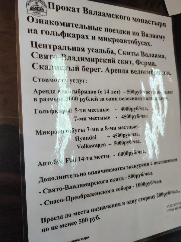 - На острове Валаам вы проводите время самостоятельно (3 часа). Можно заказать 2-часовую экскурсию с местным гидом на машинах — 8000 ₽. за машину или 5-местных гольфкарах — 9000 ₽. Также можно арендовать электровелосипеды (стоимость смотрите в разделе «Фото»)