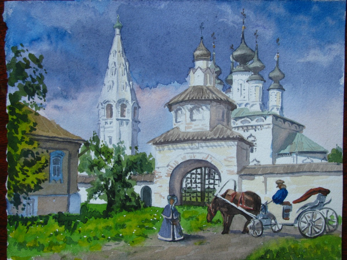 " Вы проведете несколько часов на берегу Каменки, с видом на сказочные храмы древнего центра Ростово-Суздальского княжества. Под руководством мастера запечатлеете старорусские пейзажи на профессиональной хлопковой бумаге и бархате. А также узнаете, какой путь с 18 века прошла техника акварели в России и какое место она заняла в отечественной школе живописи. "