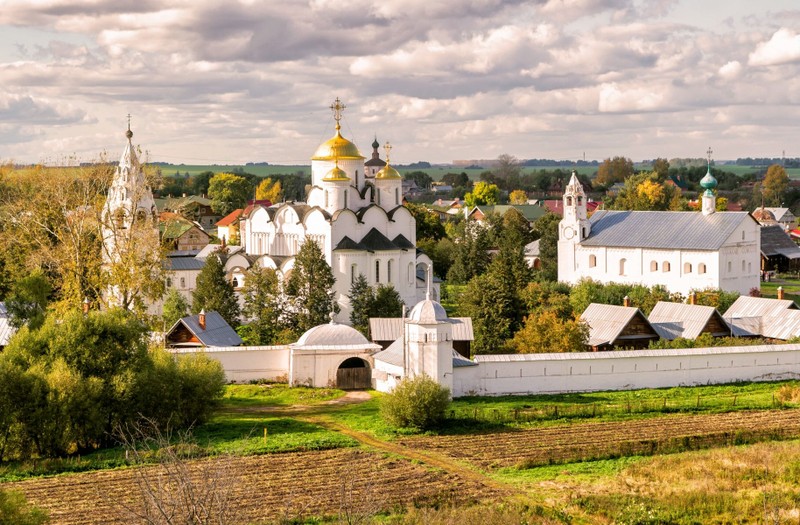Прогулка начнется от Суздальского кремля — без крепости, но с сохранившимися древними валами, на которые можно забраться. Следом пройдем через Торговые ряды, при желании поднимемся на колокольню Ризоположенского монастыря за чарующими панорамами. Если вы будете готовы пройти побольше (или у вас есть машина), то завершить экскурсию предлагаю на смотровой площадке у Александровского или Спасо-Евфимиева монастыря.