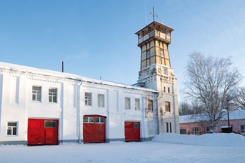 - Поднимитесь на смотровую площадку пожарной каланчи, откуда открываются великолепные виды на Тутаев, разделённый Волгой, и окрестные холмы, украшенные многочисленными церквями