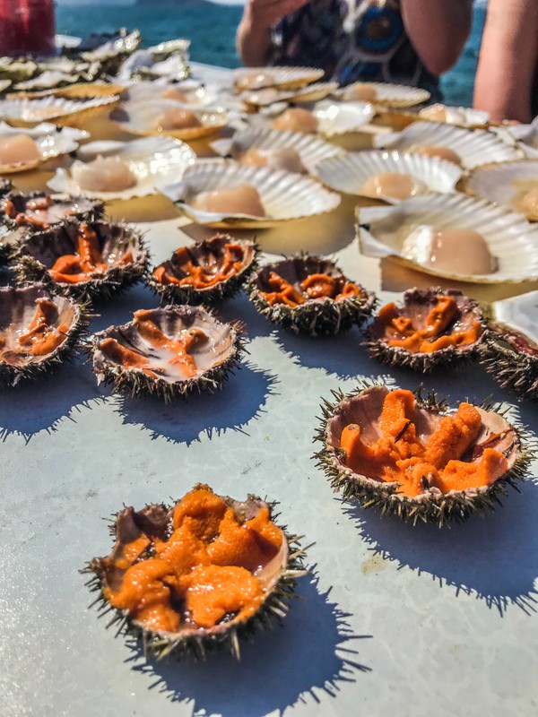 К горячему на закуску будут гребешки, устрицы, морские ежи и мидии (по сезону) — эти продукты можно есть сырыми. А дополнит обед бокал белого сухого вина.
