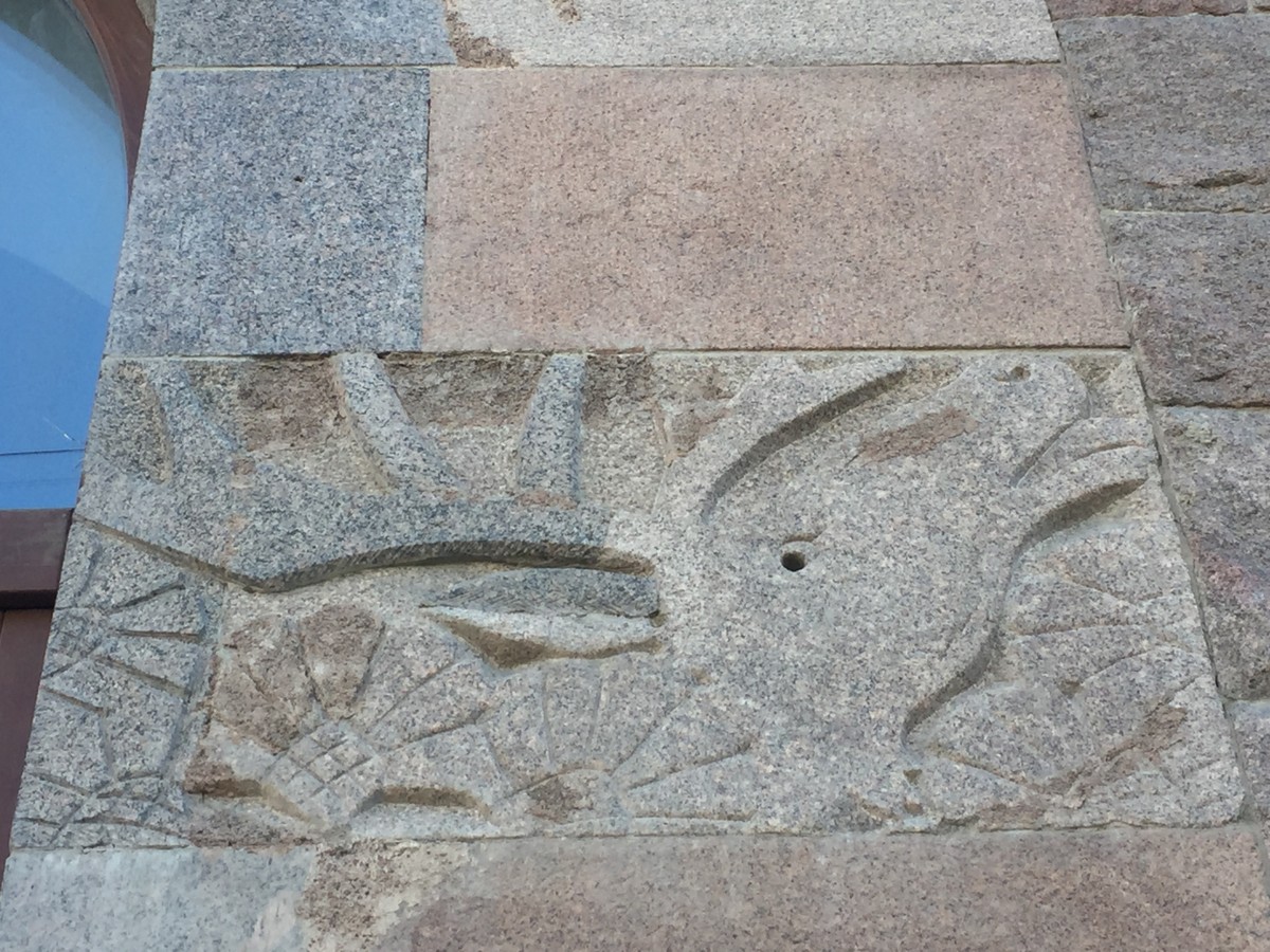 Дом Хякли и Лаллукки, где мы повстречаемся с зооморфными образами, навеянными сюжетами «Калевалы». Здесь оживают сцены охоты, обитатели озёр и лесные звери, причудливо переплетаясь в декоративном убранстве фасада. Даже юмористические рисунки арлекинов с оружием отсылают нас к подвигам легендарных богатырей.