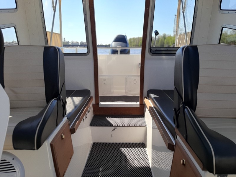 - На катере есть кабина с панорамным остеклением и отоплением и открытая палуба для любителей прогулок на свежем воздухе