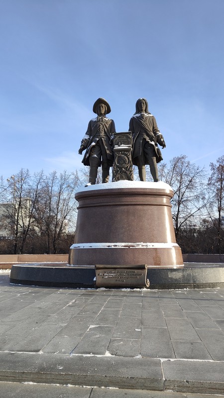 - памятник основателям Екатеринбурга. Раньше тут была камнерезная фабрика. Для нас это повод обсудить, кто нашёл аметисты на Урале