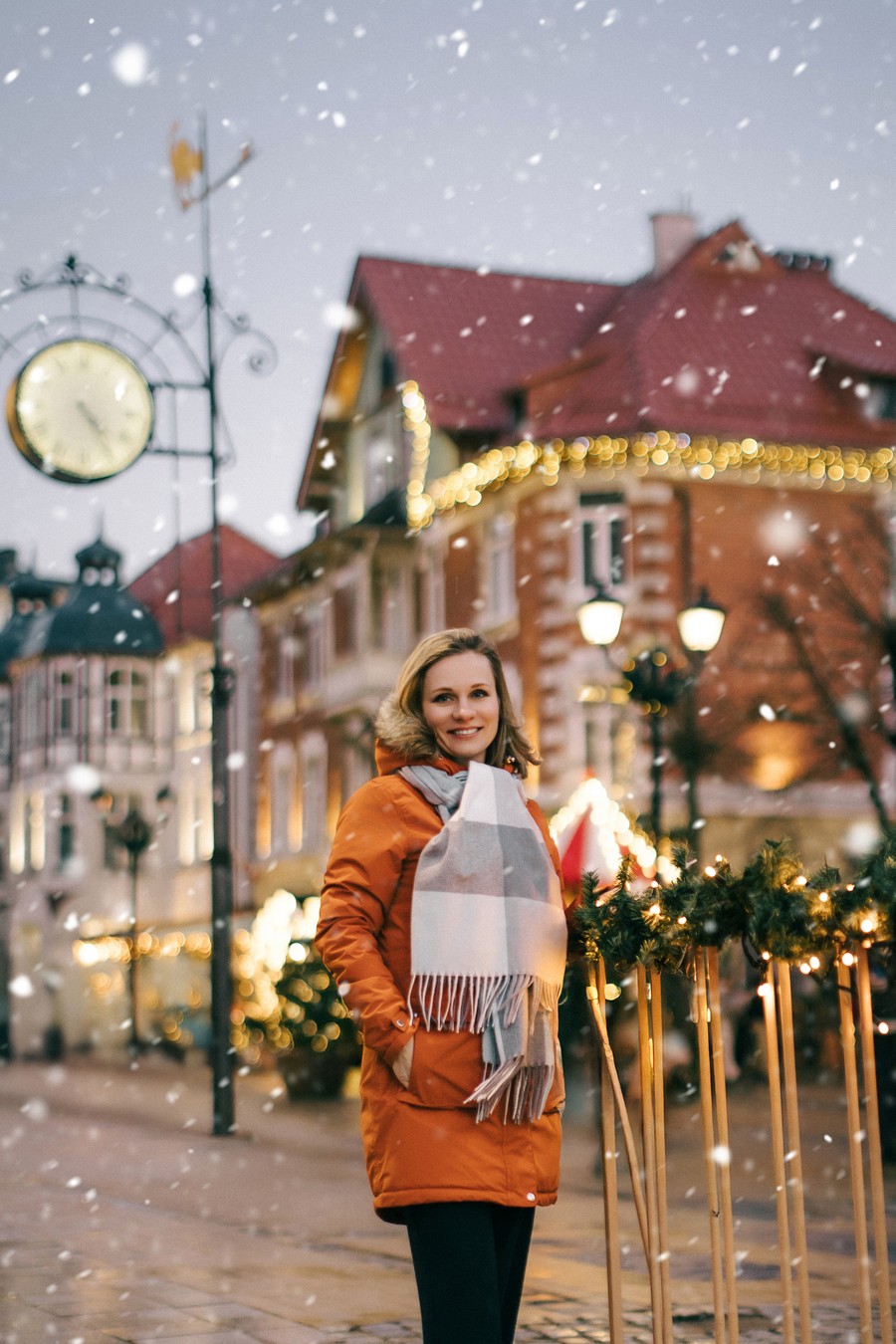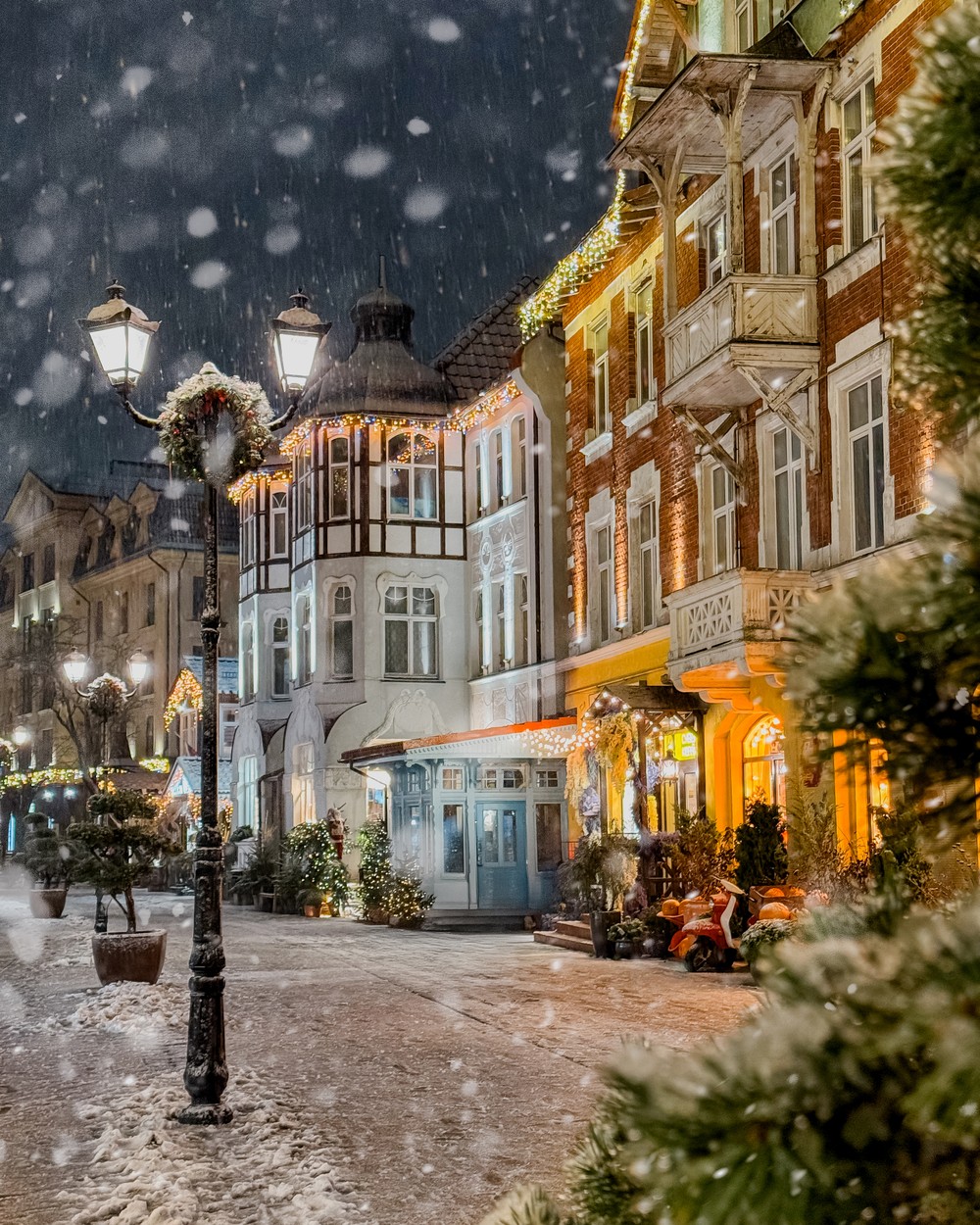 Мы пройдём по Курортному проспекту с новогодними инсталляциями, который искрится тысячами огней, увидим главную городскую ёлку с яркими шарами и гирляндами. Встретим пушистых жителей Зеленоградска — котиков, которые любят позировать на фоне зимних декораций. Если повезёт, снег добавит кадрам настоящей магии, а побережье Балтики с подсвеченным променадом подарит виды словно из рождественской открытки.