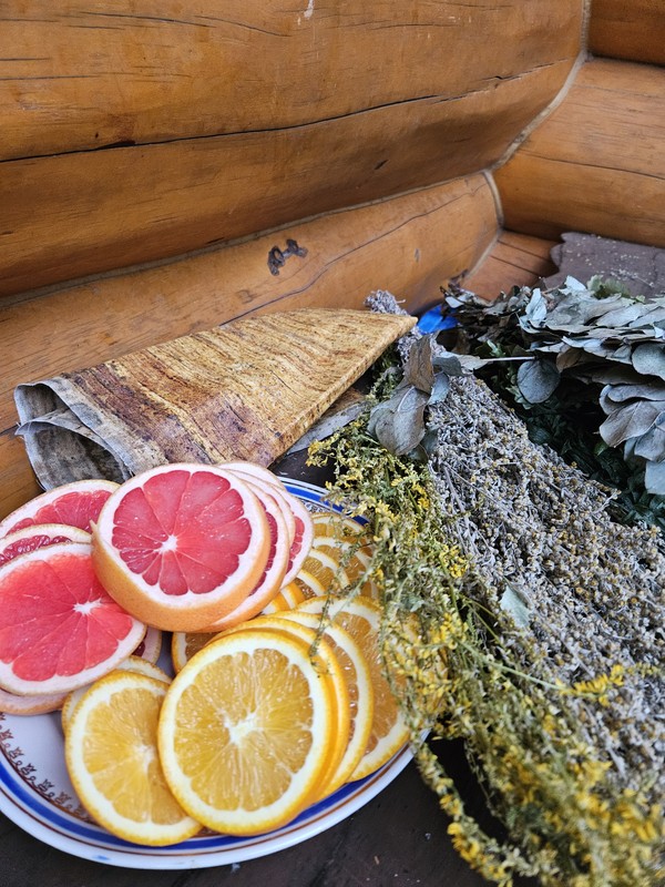 Собрание трав и веников. Вы почувствуете аромат лаванды, полыни, донника, мяты, яркие сочетания запахов дубовых веников, берёзы и сибирской пихты.