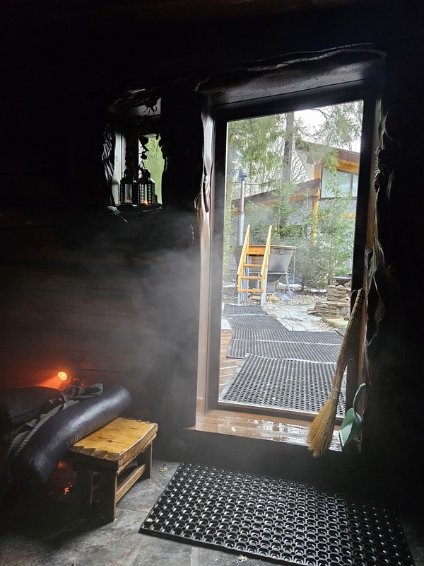 Холодная и тёплая купели с видами на живописный лес. Покупаетесь в чане с еловыми ветками и ароматной пихтой, словно в супе у Бабы-яги. Насладитесь красотой неба, отражающегося в воде.