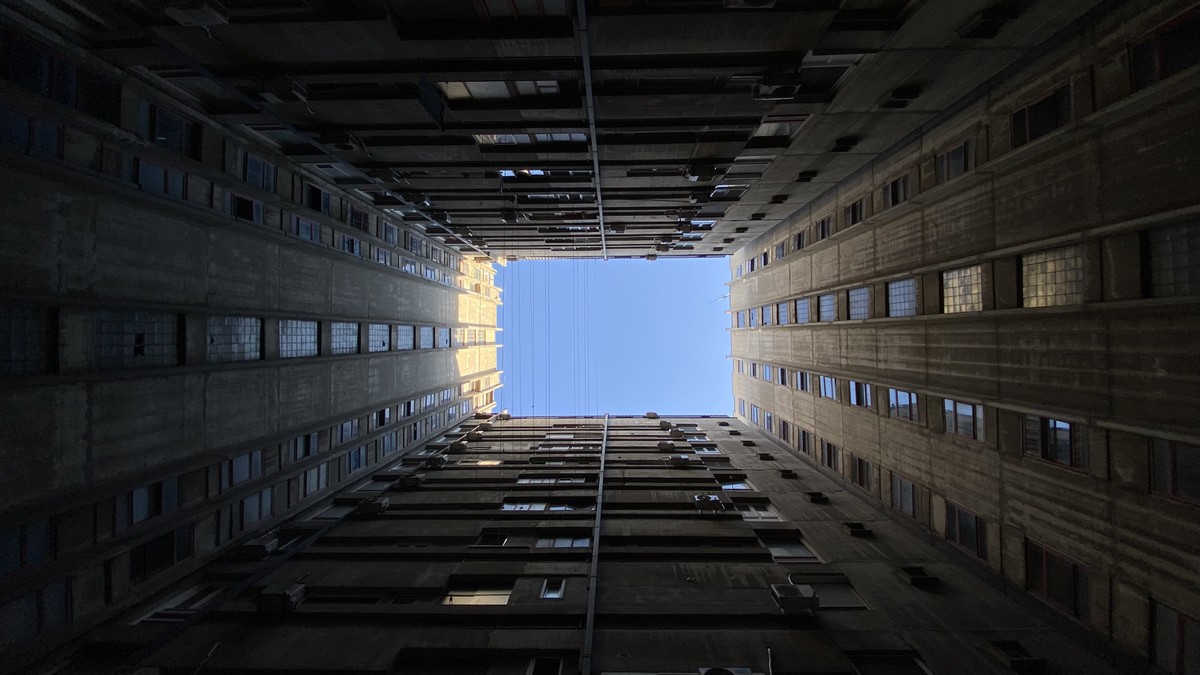 - Заглянем во впечатляющий двор-колодец длинного 10-этажного дома из голого бетона. Отсюда видно внутреннее устройство здания — подъезды, кладовые, бытовые помещения
