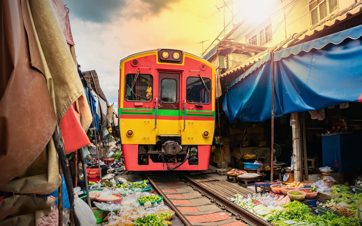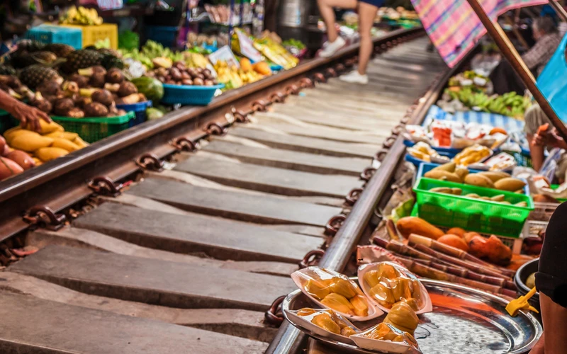 6:00 — рынок раскрывающихся зонтиков Самут Сонгкхрам. Завтрак в кафе на рельсах с видом на проходящий поезд
