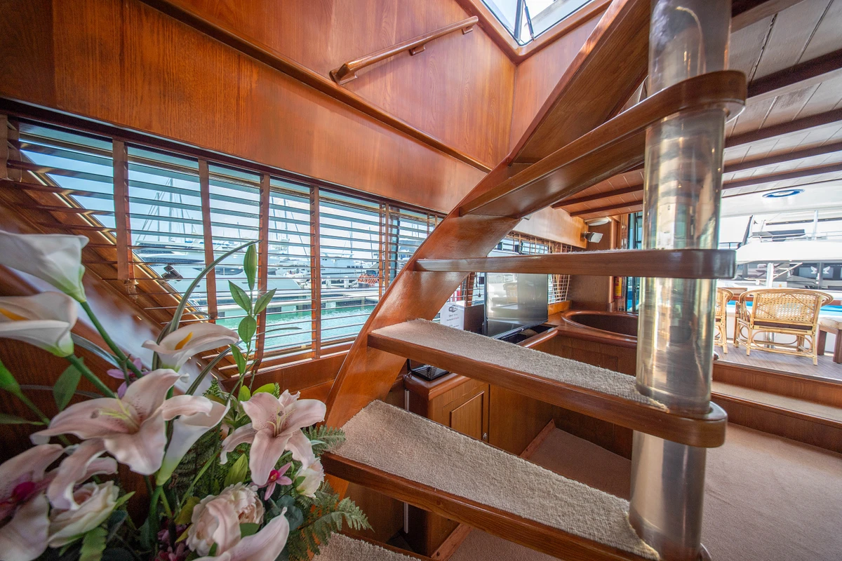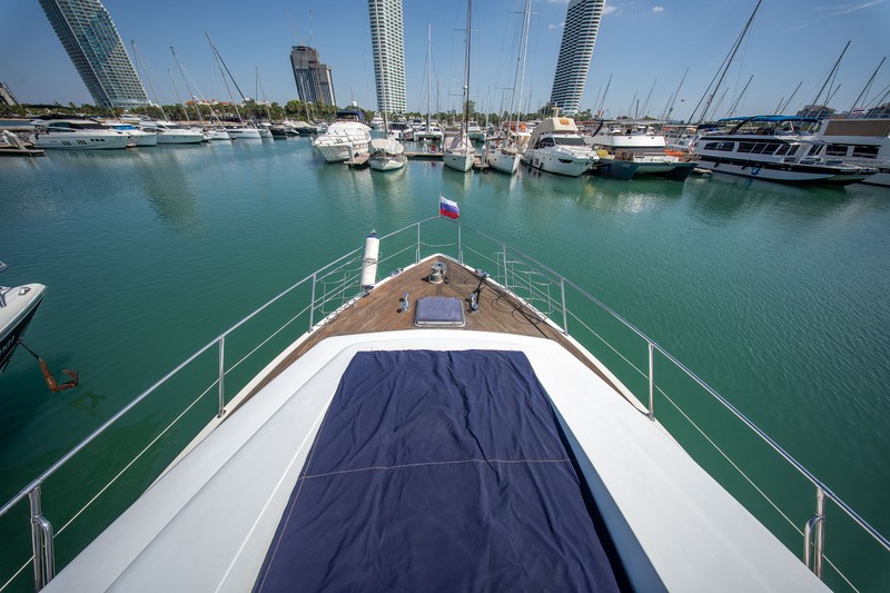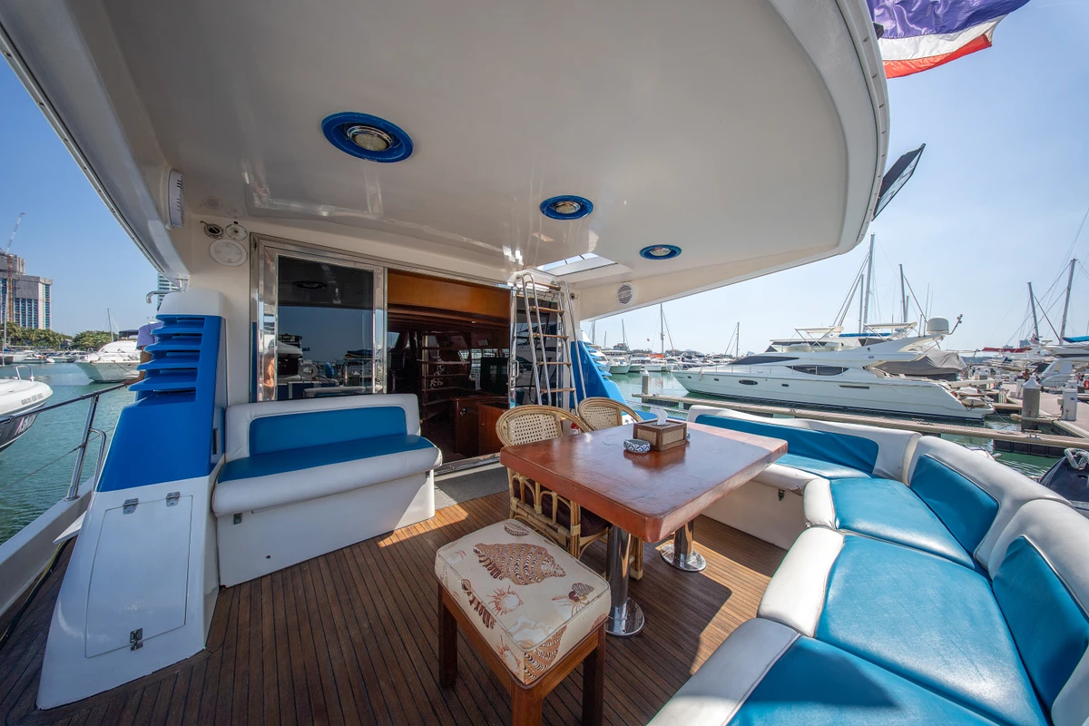 На борту есть каюты для отдыха, кухня, душ, туалет, платформа для купания, открытая верхняя палуба, холодильник, кондиционер