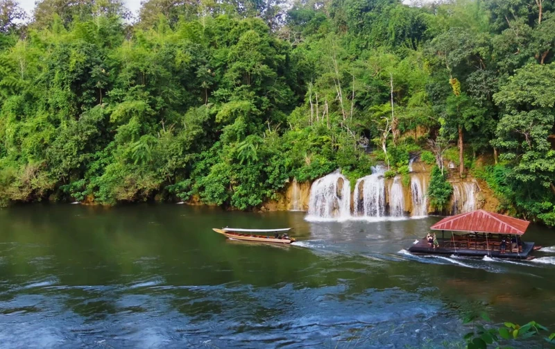 12:00 — парк шагающих деревьев, 10-метровый водопад Сайок Ной и паровоз «Дороги смерти»