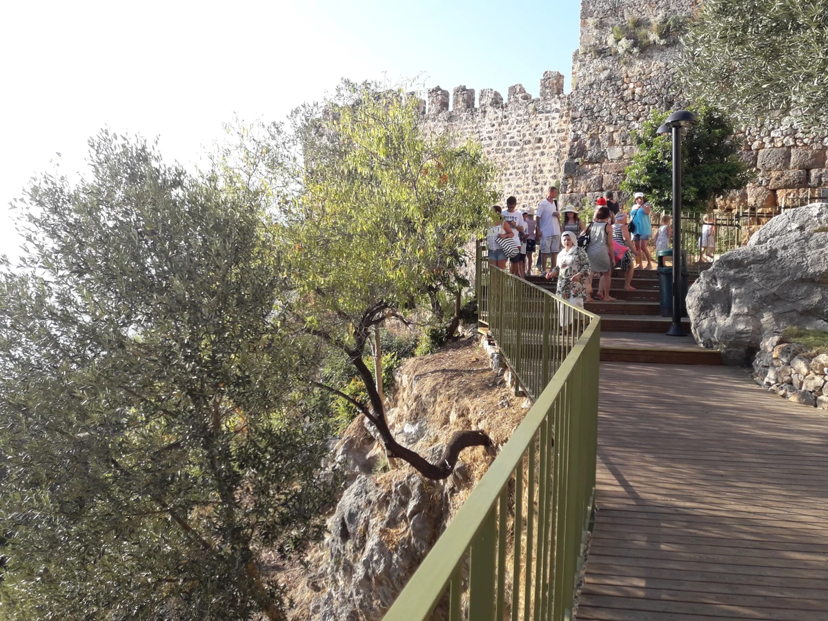 Подъём к замку по каменным лестницам и тропинкам — с потрясающими видами на город и Средиземное море.
