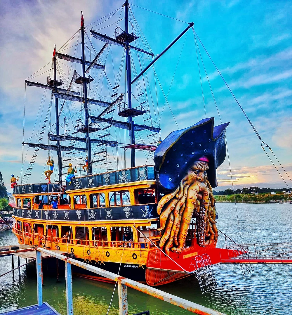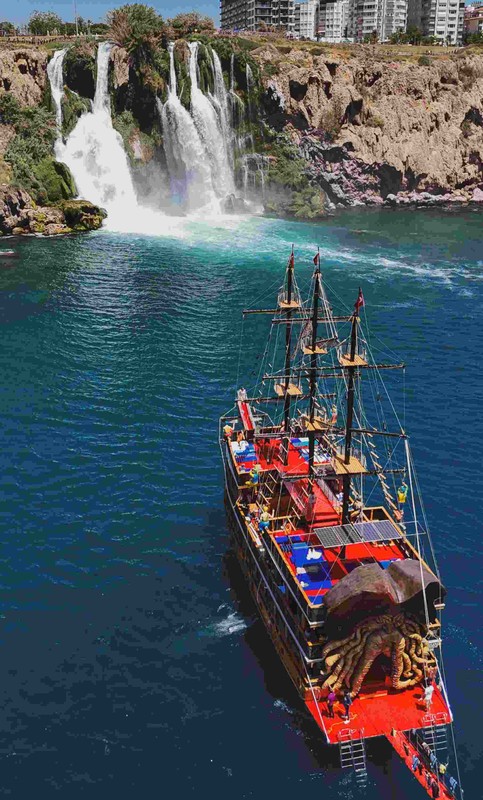 " Отправляемся в плавание на настоящем пиратском корабле! Вас ждёт день, полный драйва и морского бриза: мы дойдём до места, где воды реки Дюден эффектно обрушиваются в Средиземное море, устроим пенные танцы и превратим детей в настоящих корсаров. Это идеальный формат для тех, кто хочет совместить осмотр главных природных красот Антальи с весёлым отдыхом для всей семьи. "