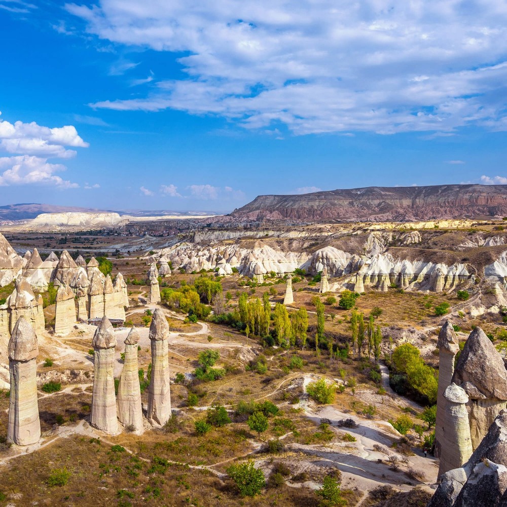 " Вы погрузитесь в пейзажи Каппадокии — подземные города, скальные долины и причудливые каменные формы. Увидите панорамы Гёреме, древние церкви и крепость Учхисар, а на рассвете, если захотите, подниметесь в небо на воздушном шаре или выберете другую активность. Два дня — и множество впечатлений и открытий. "