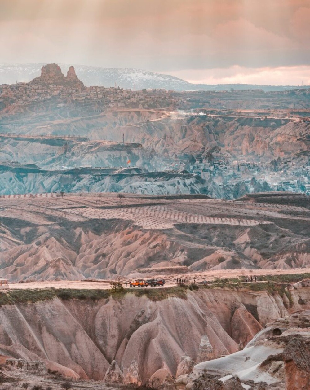 " Проведите вечер в атмосфере спокойствия и магии Каппадокии. Мы проедем по узким улочкам древнего поселения Ортахисар, основанного ещё в 11 веке, и остановимся в панорамном кафе с видом на скальную крепость. В финале поездки — закат в Красной долине, где вулканические скалы под последними лучами солнца ежеминутно меняют цвет. "