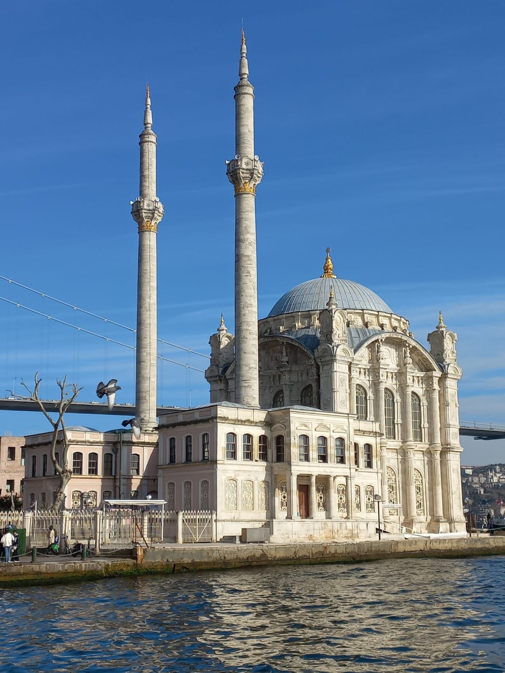На берегу пролива стоит мечеть Ортакёй — светлая, барочная, с хрустальными люстрами, богатой росписью стен и тонкой лепниной. По пути к ней вы увидите дворец Чыраган, набережную Бешикташ и бывший османский дворец 19 века.