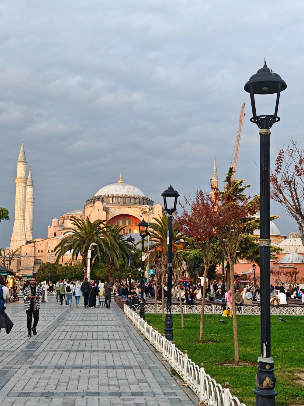 Шесть минаретов — копья, пронзившие облака. Бирюзовые изразцы — чешуя мифической рыбы, всплывшей из сна султана Ахмеда. Обойдите против солнца: стены вспыхивают, будто внутри разожгли тысячу лазурных костров. Это не мечеть — это замерший фонтан света.