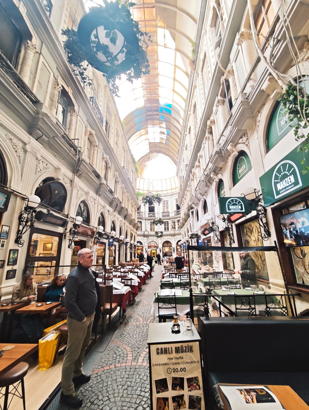 Цветочный пассаж в одном из боковых проходов — высокий зал со стеклянным потолком, витражами и десятками крошечных ресторанчиков с красными скатертями. После революции 1917 года русские аристократки продавали здесь цветы. Теперь тут подают ракы, мезе и свежую рыбу, а атмосфера такая, что хочется сесть и никуда не уходить.