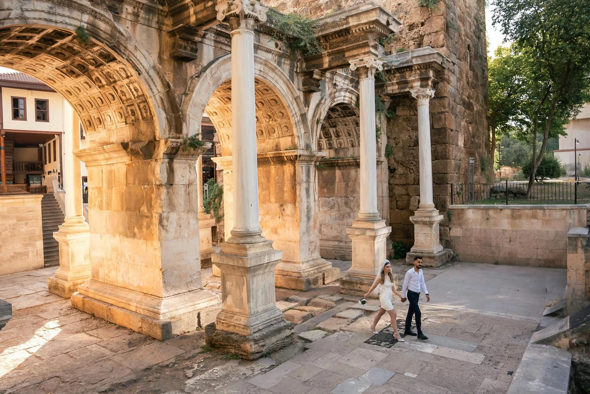 Войдём в Старый город через триумфальную арку — ворота Адриана. Узкие улочки, османские домики с резными балконами, византийская кладка, аромат цветов и кофе из каждого двора — здесь будто попадаешь в прошлое.