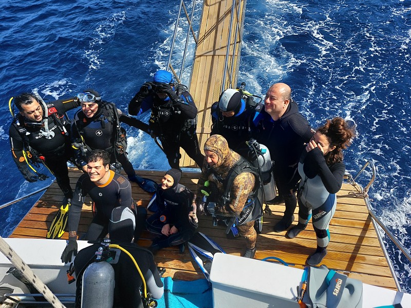 - После первого погружения вы отдохнёте, позагораете на палубе и пообедаете прямо на корабле в формате шведского стола.
