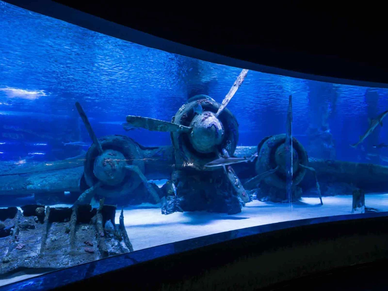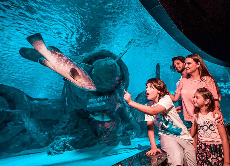 Посетите большой туннельный аквариум — 131 метр, 64 резервуара и более 10 000 морских обитателей.