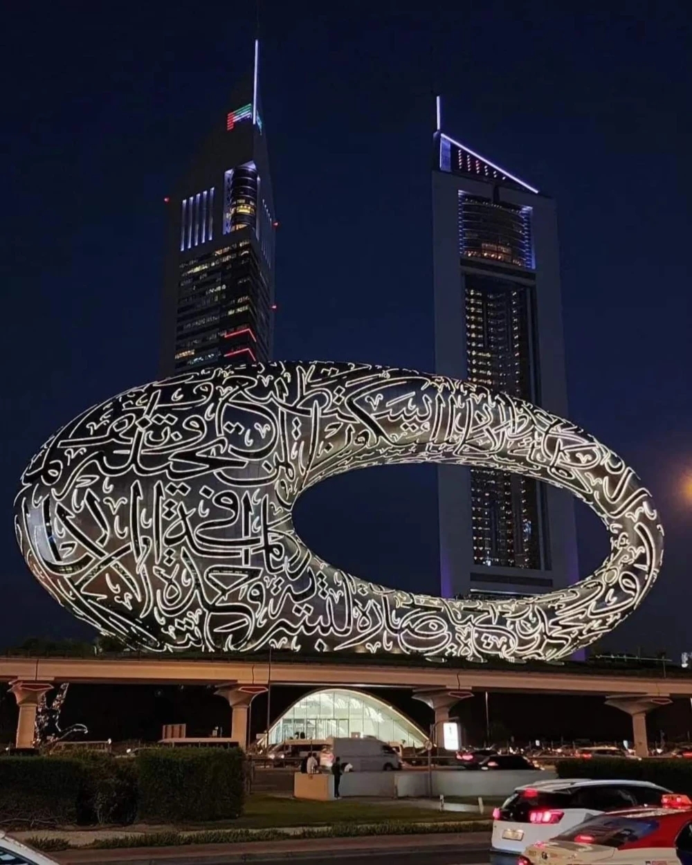 Музей Будущего (снаружи) — архитектурное чудо с подсветкой словно из другого мира.