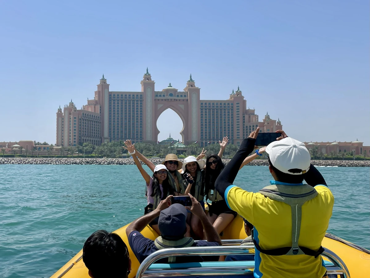 Стартуем из Дубай Марины и стремительно выходим в открытое море, пролетая вдоль небоскрёбов, песчаных пляжей и знаковых локаций побережья. Главная точка маршрута — отель Atlantis The Palm. Мы подплывём к нему с самой впечатляющей стороны и сделаем эффектные фото. После фотостопа лодка развернётся и на высокой скорости вернётся обратно, даря яркие ощущения свободы и драйва.