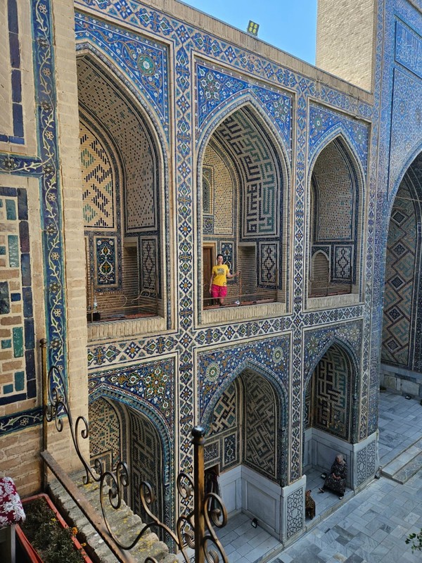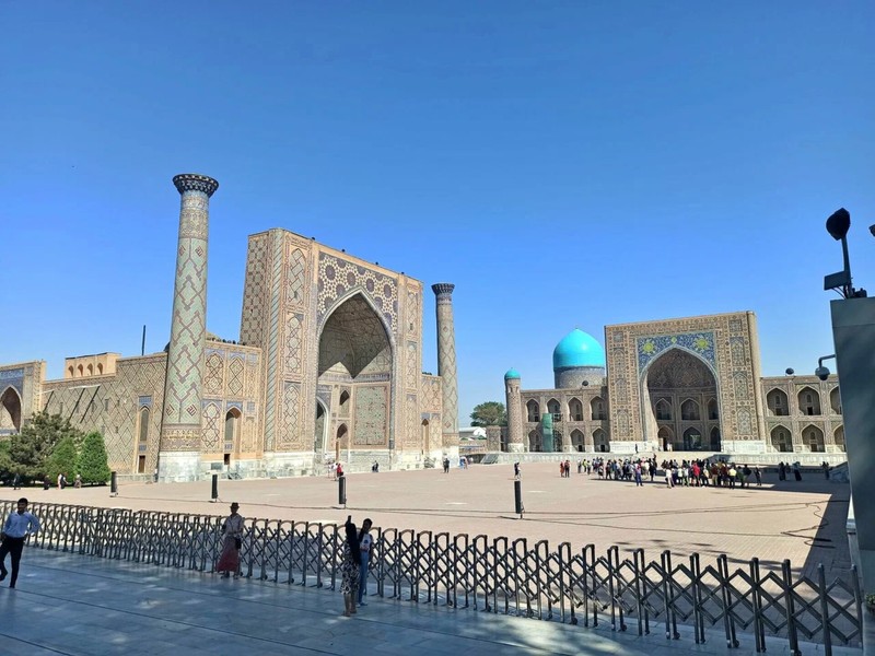 - Медресе Улугбека 15 века. Это самое старинное здание на площади, в прошлом — центр науки, где обучались астрономии, математике и философии. Фасад украшен геометрическими узорами и цитатами из Корана