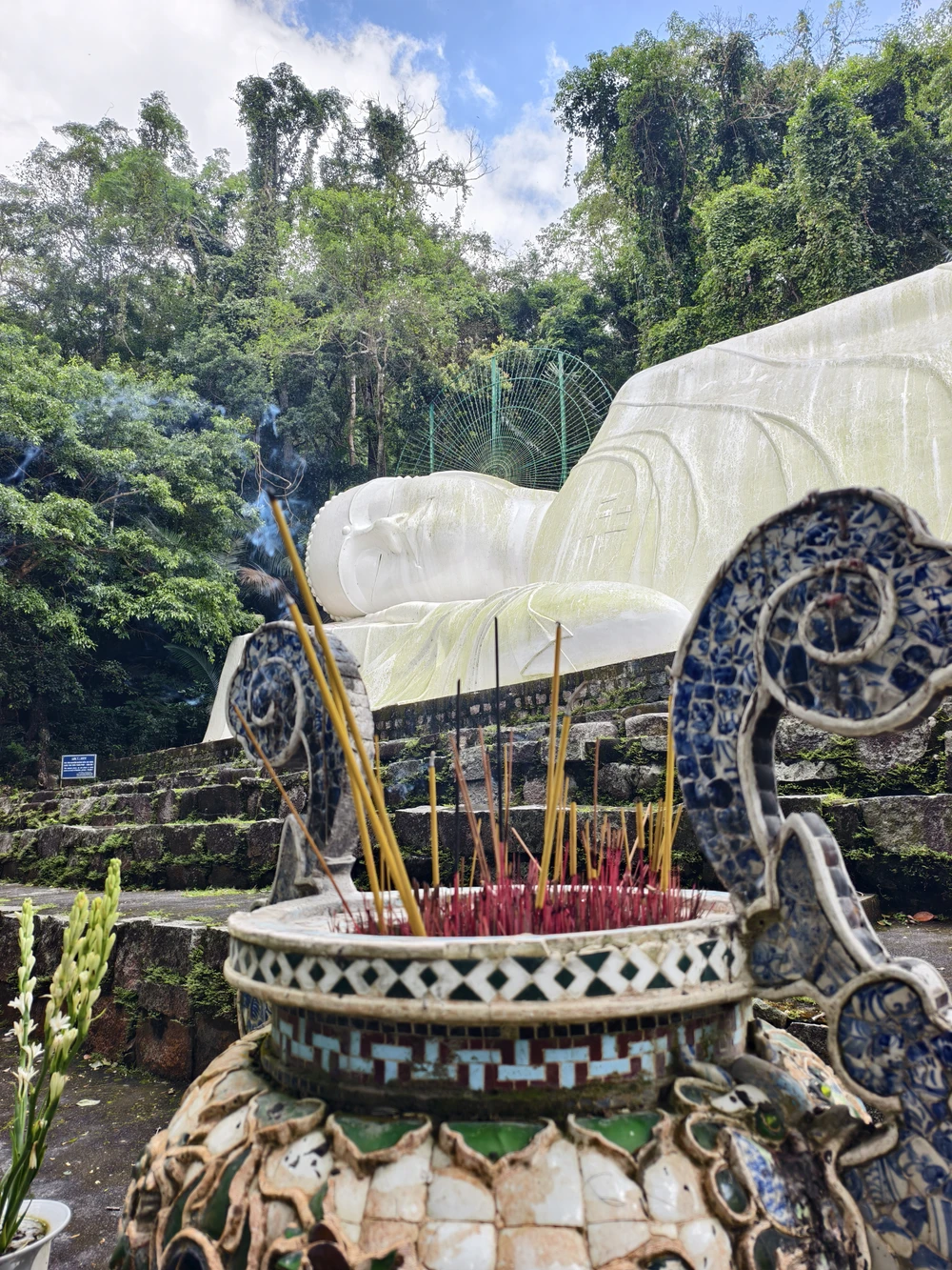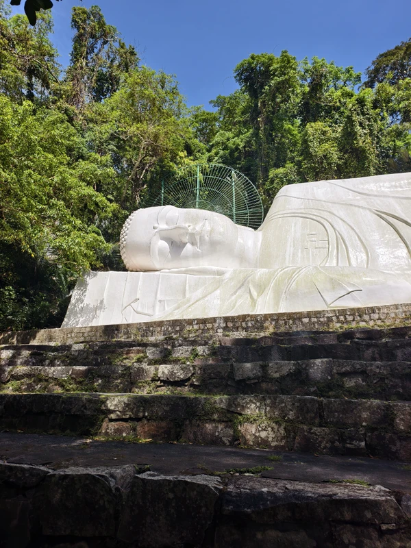 Первым делом вы отправитесь к одному из самых почитаемых мест среди буддистов Вьетнама — горе Таку. Подниметесь на фуникулере на высоту около 500 метров, пройдете через старый буддийский монастырь и окажетесь у крупнейшей статуи лежащего Будды во Вьетнаме длиной 49 метров. По пути вы оцените панорамные виды на джунгли с канатной дороги, услышите легенду о монахе-целителе, а также узнаете о распространении буддизма в стране, его основных школах и базовом учении Сиддхартхи Гаутамы — Четырех благородных истинах.
