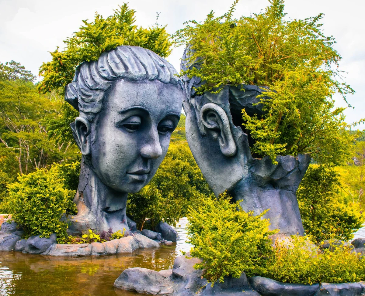 Главная фотозона Далата с монументальными каменными головами влюблённых над зеркальной гладью воды. Ранний визит позволит сделать отличные кадры без толпы туристов.